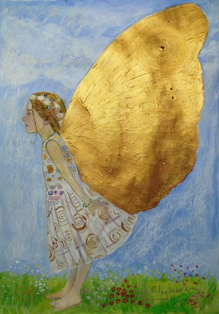Το έργο «Χρυσά Φτερά» του Χανιώτη καλλιτέχνη Ιγγλεζάκη Ματθαίου αναπτύσσει έναν ποιητικό κόσμο όπου το φανταστικό συναντά το συμβολικό. Κεντρική μορφή είναι μια νεράιδα, αποδοσμένη με ευαισθησία και λεπτότητα, της οποίας τα χρυσά φτερά λειτουργούν ως σύμβολο ελευθερίας, πνευματικής ανύψωσης και εσωτερικού φωτός. Η χρωματική παλέτα, με κυρίαρχους θερμούς τόνους του χρυσού σε αντίστιξη με απαλές αποχρώσεις του φυσικού τοπίου, δημιουργεί μια ατμόσφαιρα ονειρική και διαχρονική, παραπέμποντας τόσο στη μυθολογία όσο και στη σύγχρονη εικαστική αναζήτηση.